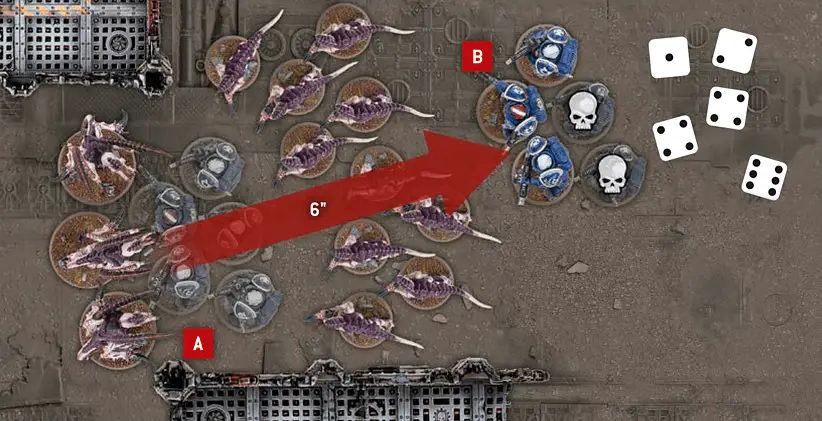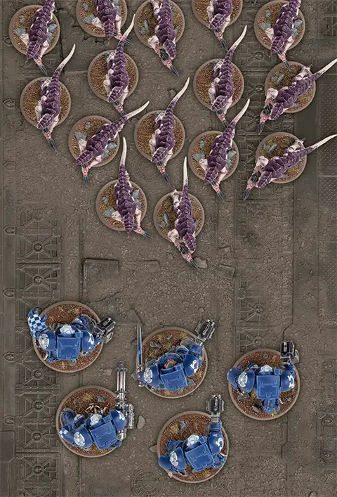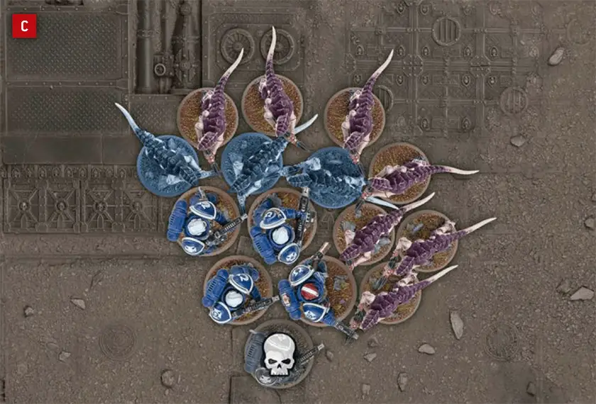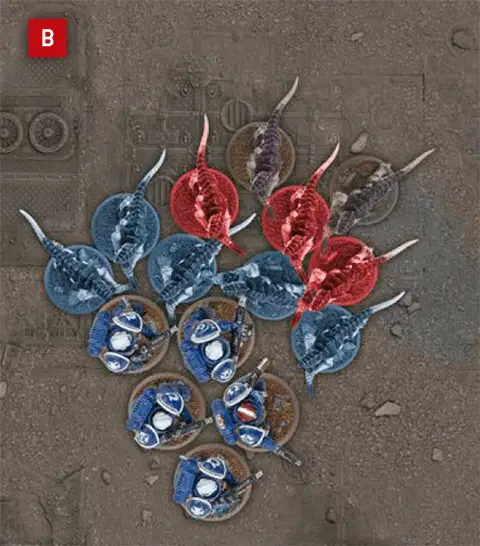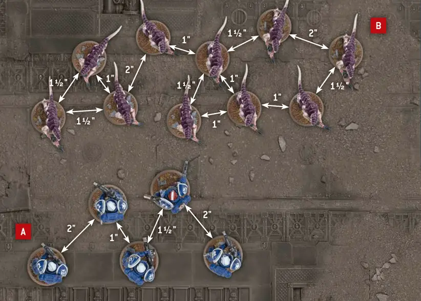 A | Each model in this Sternguard Veterans unit of five models is within 2" of at least one other model in the unit. This unit is therefore in Unit Coherency. | B | Each model in this Termagants unit of ten models is within 2" of at least two other models in the unit. This unit is therefore also in Unit Coherency. |