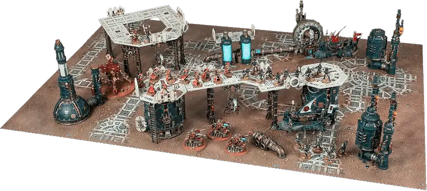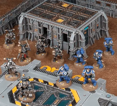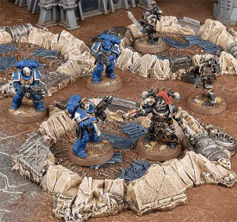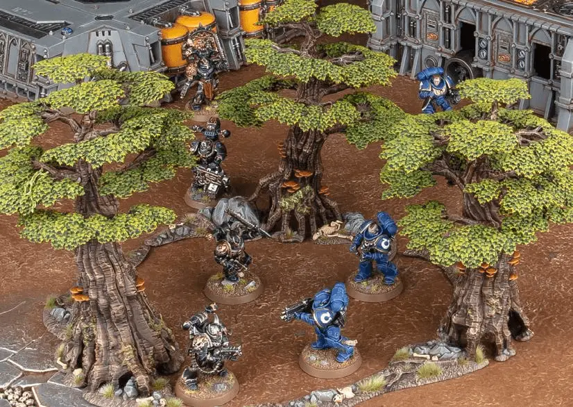 The scenery on a battlefield can be represented by models from the Warhammer 40,000 range. These models are called terrain features to differentiate them from the models that make up an army. Terrain features are set up on the battlefield before the battle begins. You can find out more about terrain features
